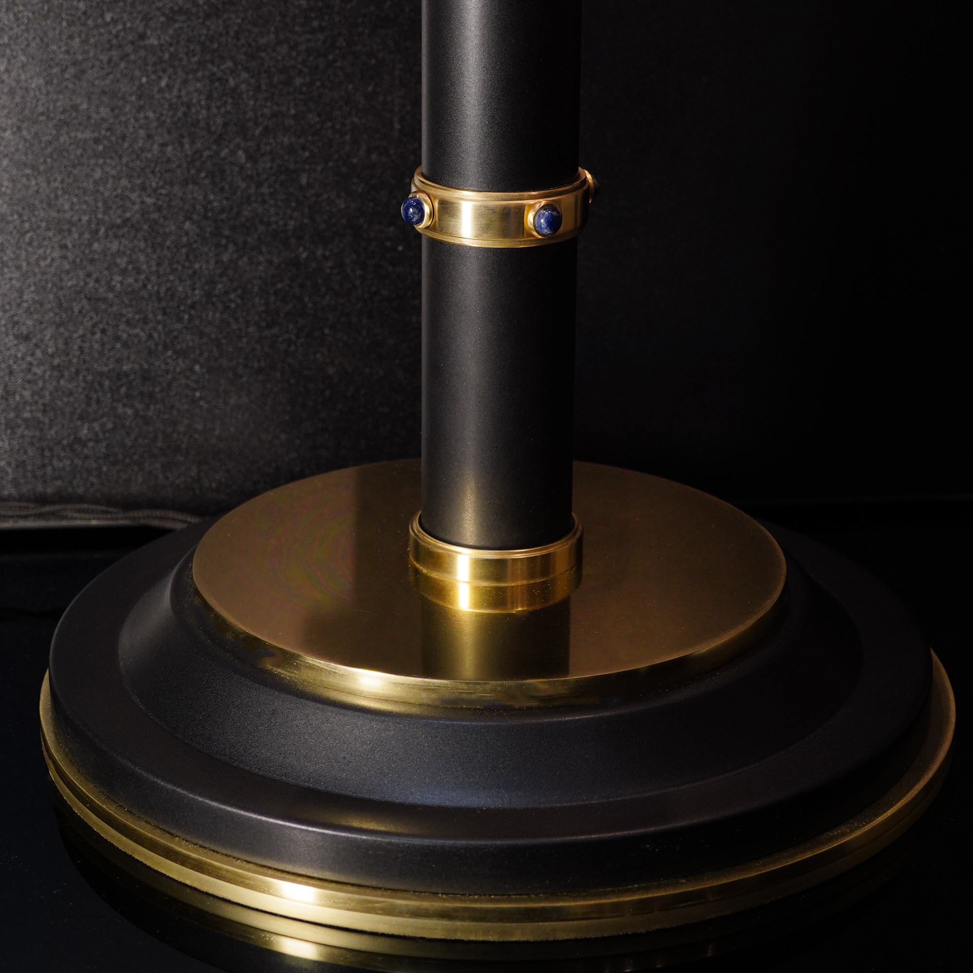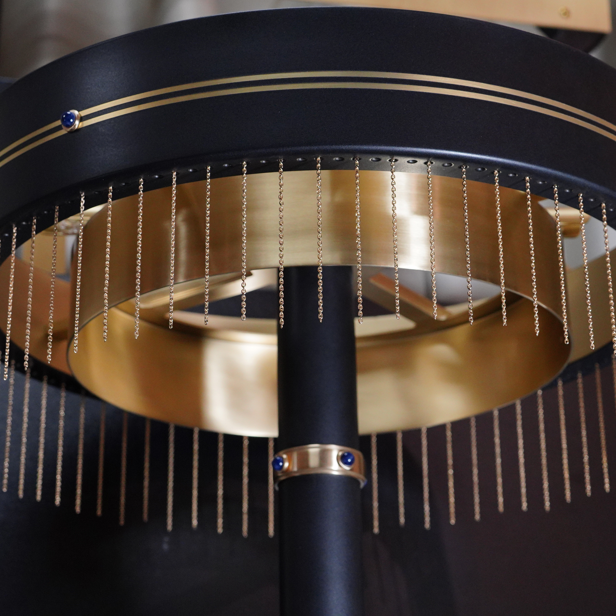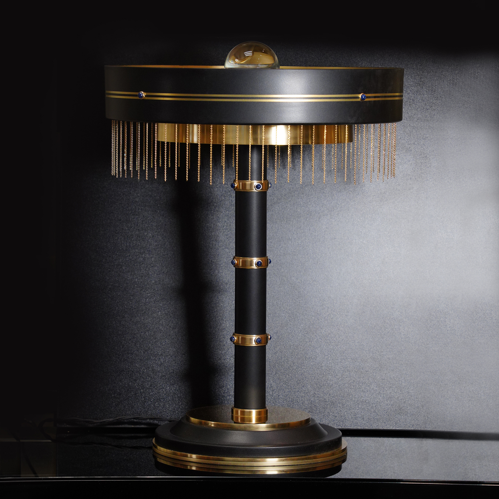 На устойчивой базе располагается стальная стойка лампы. Оригинальный абажур состоит из двух концентрических колец на металлическом основании. Внешнее кольцо украшено бахромой, которая воплощает идею вуали. Декоративные кольца стойки из благородной латуни инкрустированы натуральными сапфирами.